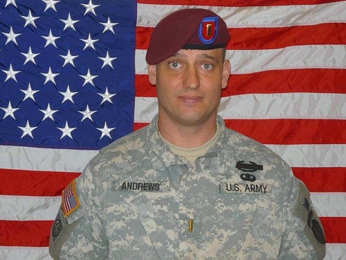 On 4 September 2009, [w]hile recovering a vehicle that was disabled, Second Lieutenant Andrews' Platoon came under heavy RPG fire. Second Lieutenant Andrews fatally placed himself between the incoming enemy fire and his fellow comrades. His courage under fire was essential in saving another Soldier's life, and saving the lives of five other Soldiers who were with him.
